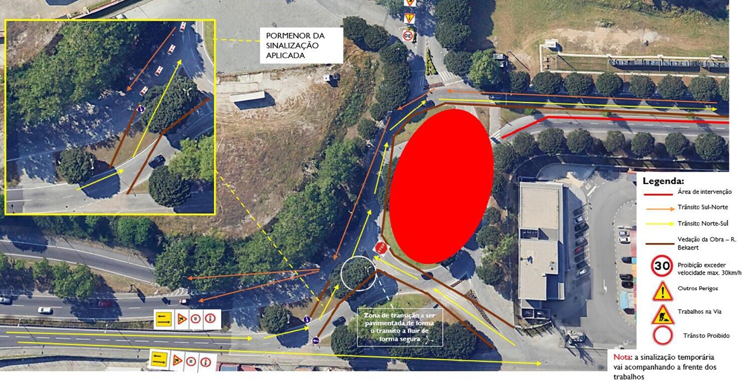 A rotunda será temporariamente suprimida entre 5 de março e 25 de maio, passando a circulação a ser feita através de um corredor único de trânsito devidamente sinalizado, acompanhando a evolução da frente de obra.